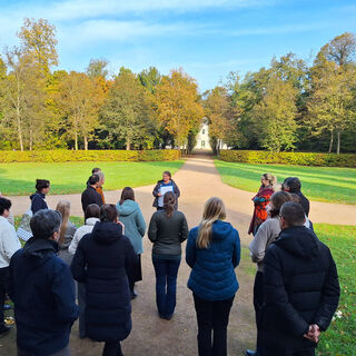 Bei strahlendem Sonnenschein führte Dr. Kirsten Lott, Referatsleiterin Stadtgrün bei der Stadt Dessau-Roßlau, die Gruppe zu Beginn des Workshops durch den beeindruckenden Georgengarten. Sie gab den rund 30 Teilnehmenden nicht nur spannende Einblicke in die Geschichte der Parkanlage, auch die aktuellen Entwicklungen wurden anschaulich und kurzweilig von Frau Dr. Lott vorgestellt. Zudem wurden die typischen Merkmale eines Landschaftsparks  anhand von Sichtachsen, Kleinarchitekturen und Geländeformungen bei der Führung vorgestellt.