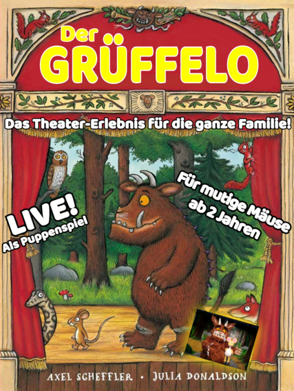 In einem großen Wald lebt eine kleine Maus. Dort gibt es einige Tiere, die die Maus liebend gern verspeisen würden: nämlich die Eule, den Fuchs oder die Schlange. Aber die Maus ist schlau und weiß sich zu helfen. Sie erfindet einfach den Grüffelo – ein Monster mit feurigen Augen, schrecklichen Klauen, einer grässlichen Tatze und einer giftigen Warze im Gesicht. Wenn die Maus den anderen Tieren vom gefährlichen Grüffelo erzählt, bekommen die es mit der Angst zu tun und flüchten vor ihr. Was für ein Glück, dass es das Ungeheuer in Wirklichkeit gar nicht gibt, denn die Maus hat ihn sich ja nur ausgedacht. … oder?